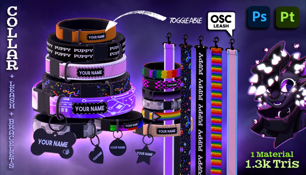 Disclaimer: The packages are based and setup for VRChat use. OSC leash and Pride materials do not work outside of Unity. (Pride textures are still included and easy to port outside of Unity with the aid of the provided Substance file)